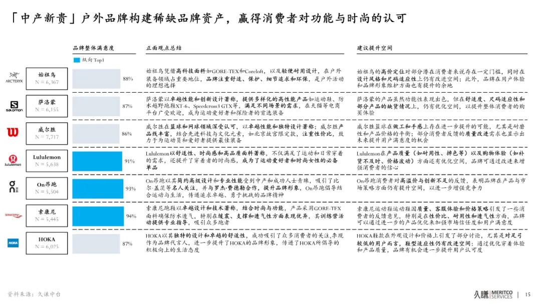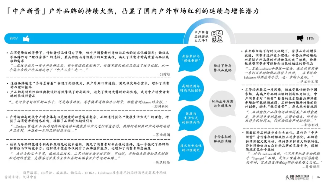 中產新貴户外品牌通過沉澱稀缺品牌資產、強化產品創新與營銷能力,奠定了強勁品牌向心力與持續增長動力,品牌旗艦店的銷售額持續刷新記錄,Q2達到新高點。無論是推出創新面料技術,持續拓展產品線,還是通過社媒營銷、社羣運營與消費者溝通,這些品牌都表現出色,消費者平均滿意度高達89%,確保了品牌的長期競爭優勢與成長動能。