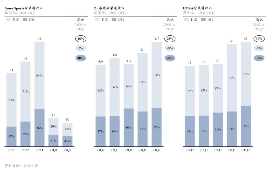 值得一提的是,DTC策略成為推動品牌增長的關鍵因素。Amer Sports在第二季度的DTC業務同比增長40%,On昂跑和HOKA分別實現28%和33%的增長。無論是通過線下直營店還是電商渠道,DTC模式的深化已然成為品牌擴展的核心戰略。