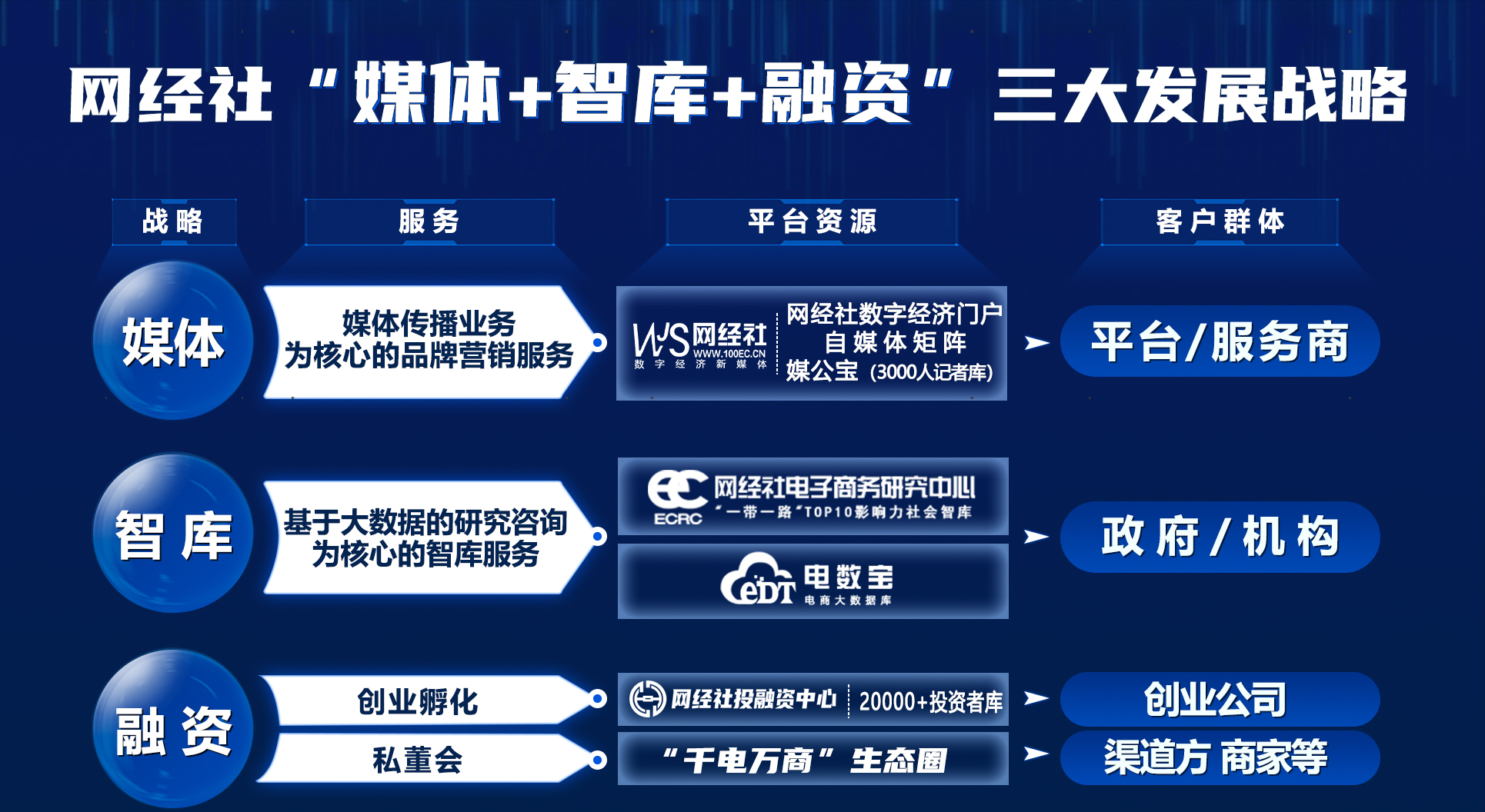 曹磊介紹到,網經社擁有17年曆史,旗下運營:**網經社(數字經濟門户)、網經社電子商務研究中心(智庫)、“電數寶”(大數據)、“投融中心”(FA)、“千電萬商”生態圈(B端)、“電訴寶”(C端)**等系列子品牌/平台/產品,提供媒體、研究、數據、融資、營銷、顧問等服務。依託最新的“平台+智庫+融資”三大發展戰略,實現“三輪驅動”,致力於打造大數據驅動的“中國領先的數字經濟服務商”。