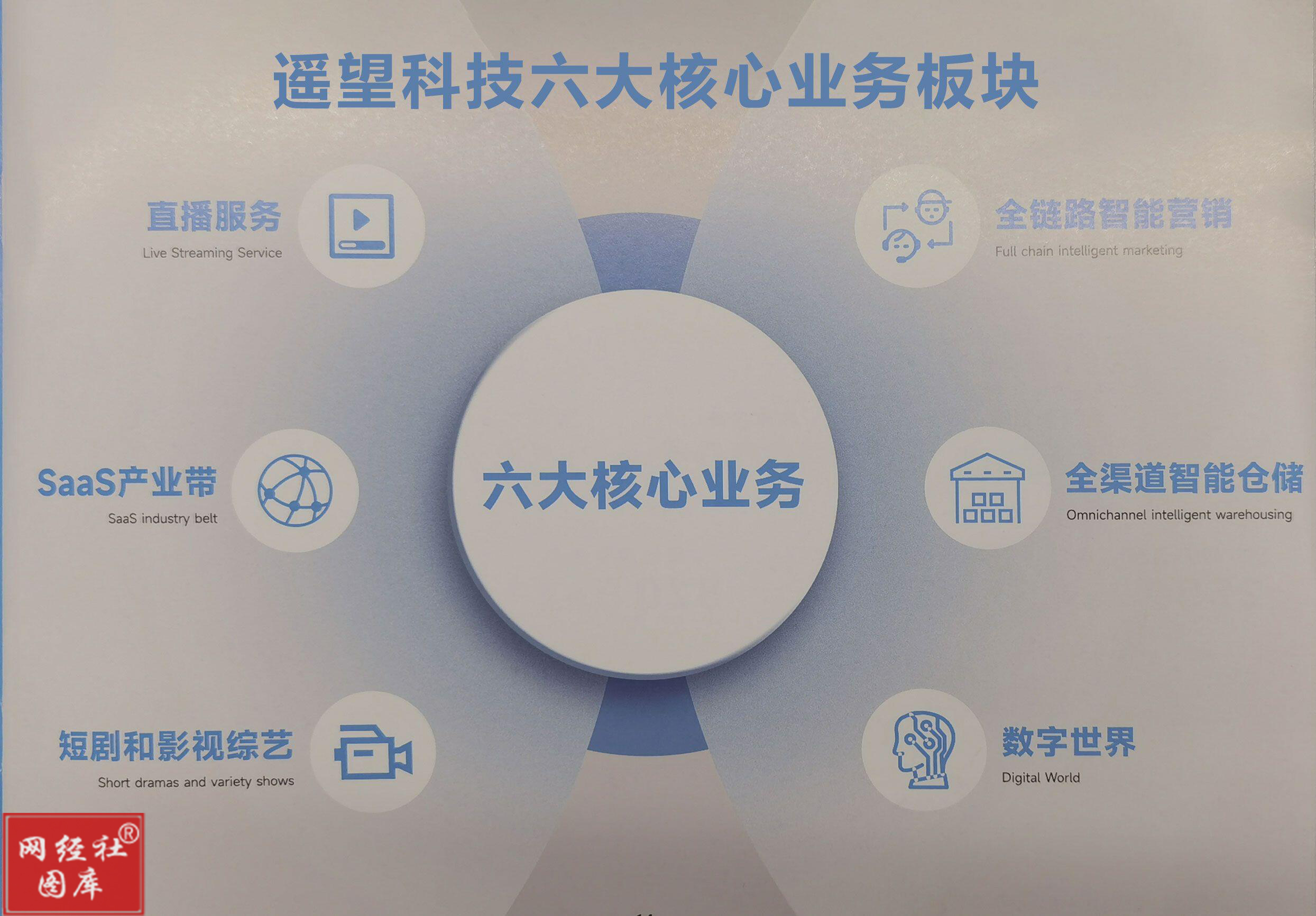 遙望科技六大核心業務包括:直播服務、SaaS產業帶、短劇和影視綜藝、全鏈路智能營銷、全渠道智能倉儲、數字世界。