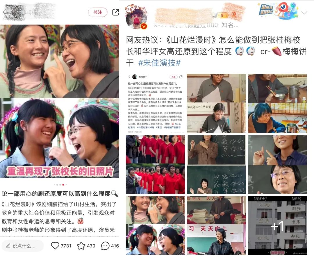 關於“含金量”的眾多討論焦點,不僅在於原型張桂梅的故事,更在於劇集對原型故事的真實還原。不少網友自發扒出劇中1:1還原現實的畫面,製作出一組組對比圖,感嘆“還原度太高了”。