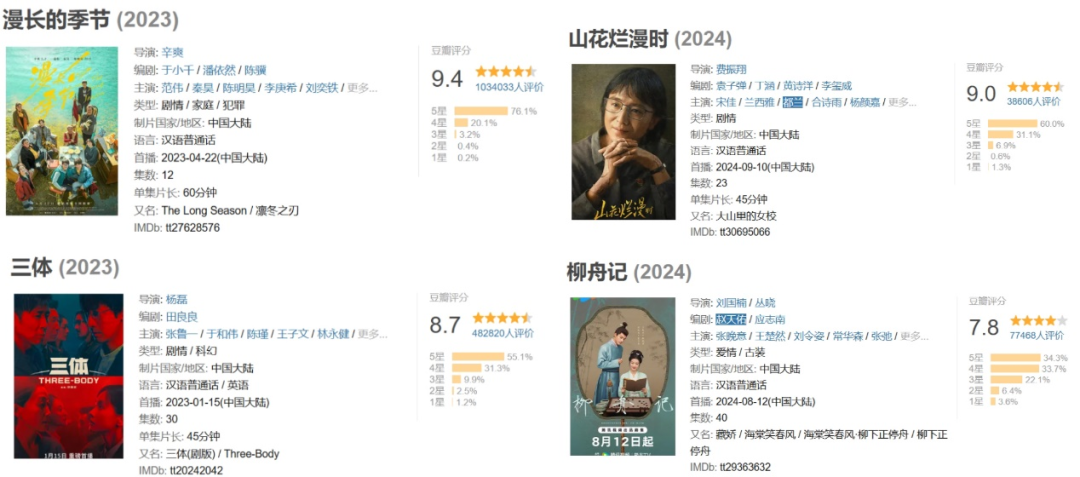 好在這些“冒險”都有了好的回應。《漫長的季節》《三體》是去年豆瓣評分前三甲的劇集,《山花爛漫時》《柳舟記》分別是今年目前豆瓣評分最高的劇集和評分最高的古偶劇。