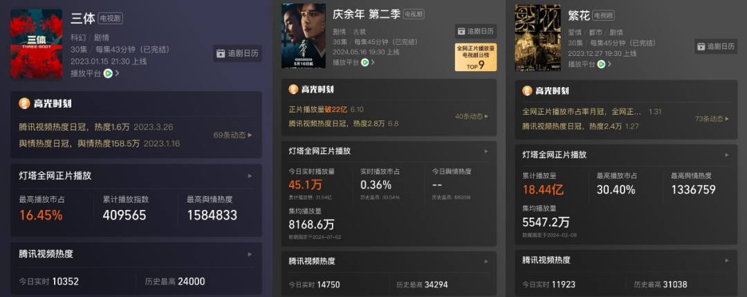 另一方面,一些系列化作品的推出,在某種程度上也是騰訊視頻劇集佈局穩中向好的證明。這兩年,“鬼吹燈”系列、《長相思》系列、《慶餘年》系列,都是騰訊視頻在IP項目跑通的代表。IP系列化作品,也成為騰訊視頻佔據身位優勢的領域。