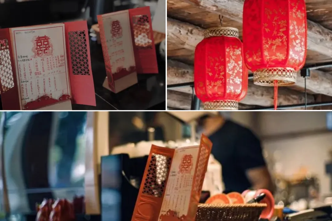 還有廣東中山的四囍咖啡店,隨處可見囍字窗花、囍字花杯、囍字抱枕等,還有落地玻璃窗也有happy wedding的字樣,是很多情侶收藏的寶藏咖啡館。