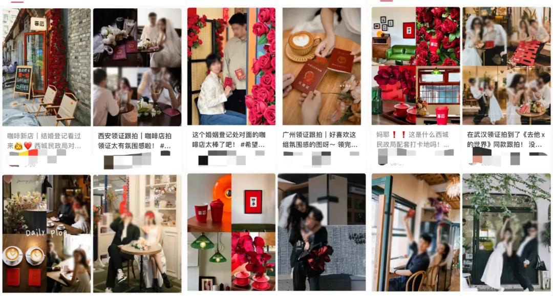 小紅書上,關於“領證拍照”的筆記高達39萬+,在眾多場地選擇中,咖啡館人氣較高,由此催生了喜證類主題咖啡館。