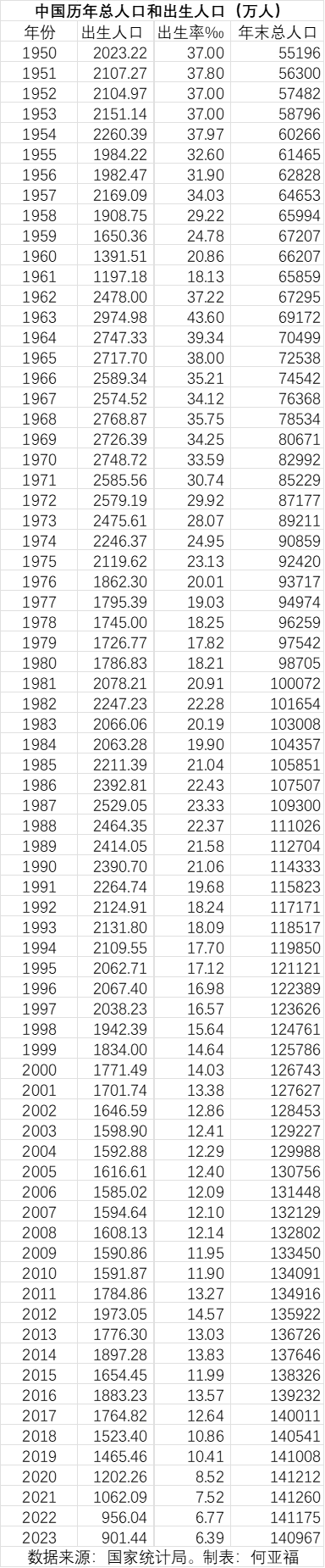 下表是1950-2023年中國總人口、出生人口和出生率。出生人口數據,是根據國家統計局公佈的歷年總人口和出生率計算而得(保留兩位小數),計算公式是:某年出生人口=該年出生率x該年平均人口,而該年平均人口=(上年末總人口+該年末總人口)/2。