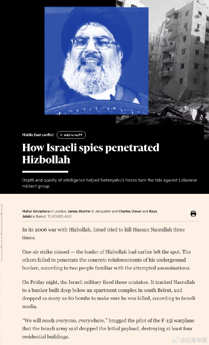 Ft長文介紹了以色列是如何滲透真主黨的,幾個有意思的細節:1、2006年與以色列曾三次試圖殺死納斯魯拉。但是一次空襲失敗,納斯魯拉此前已離開現場。其他兩次空襲均未能穿透其地下掩體的混凝土加固層。但這次以色列吸取了之前的教訓。