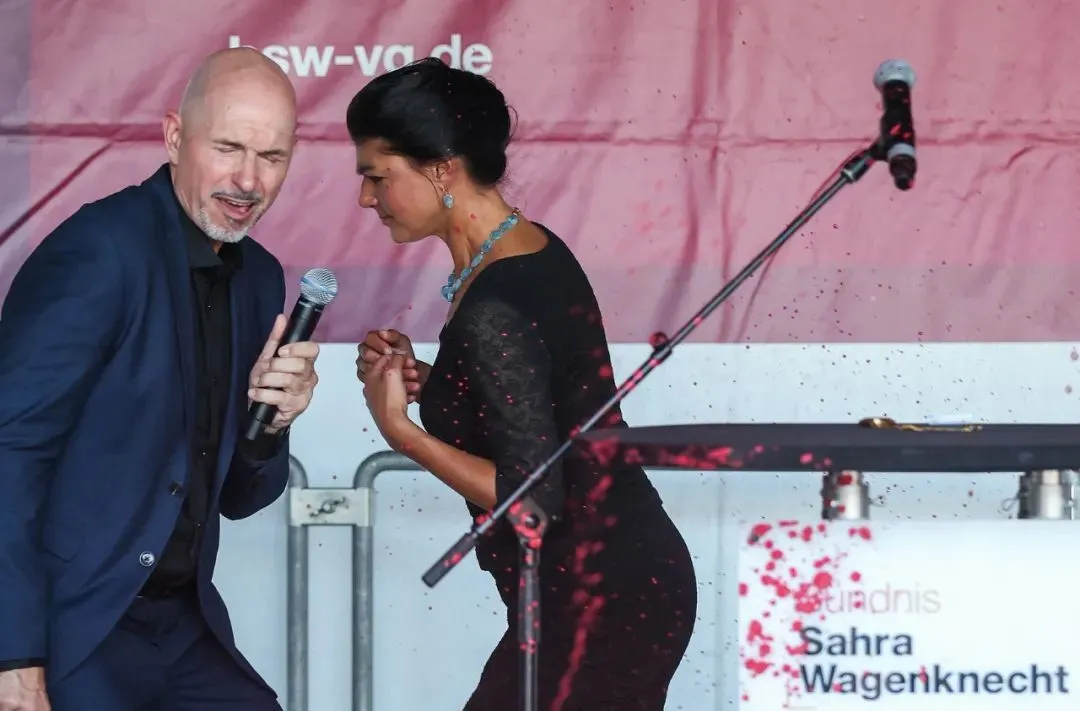 8月29日,德國圖林根州,莎-瓦聯盟的創始人莎拉·瓦根克內西特(右)在一次競選集會中被潑紅漆。