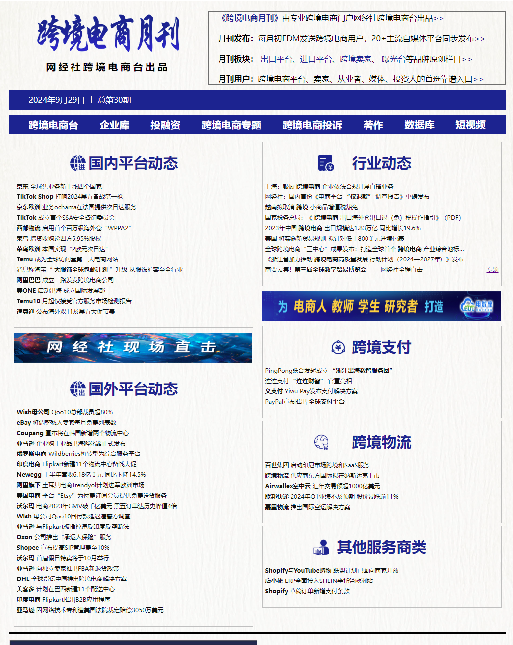 2024年9月,跨境電商領域又有哪些事? 以下是我國“一帶一路TOP10影響力社會智庫”“中國跨境電商50人論壇”副秘書長單位——網經社,旗下跨境電商台為您帶來9月跨境電商領域各電商平台、賣家及服務商最新動態回顧。