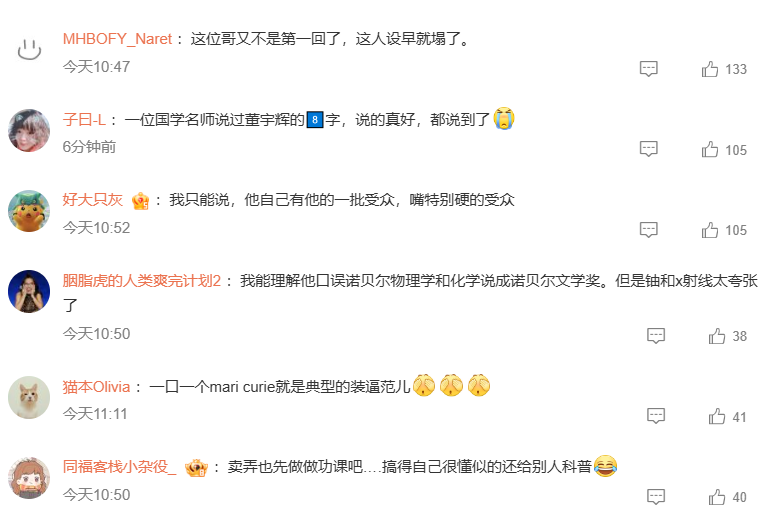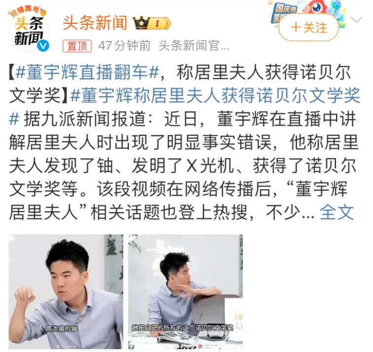 這好像是董宇輝第三次翻車了。9月30日,董宇輝翻車又上了熱搜。他在直播間談到女性在科學行業的貢獻時,談到了居里夫人。稱居里夫人發現了鈾元素、發明了X光機,還獲得了諾貝爾文學獎。而且將濃縮鈾的鈾讀作“又”。