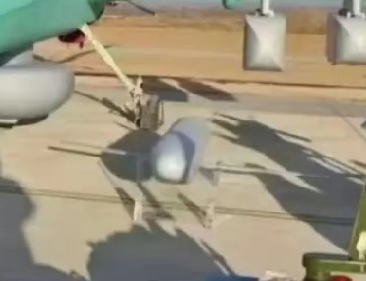 從公開的照片看,這架察打一體無人機通體使用綠色塗裝,可能是使用了複合材料蒙皮,機翼下方安裝有四個掛帶了大型吊艙的掛架。很奇怪的是,該機的主翼翼尖部位帶有小翼,在縮短了主翼翼展的同時可以有效增升,在現有的察打一體無人機中,算是非常獨特的設計。