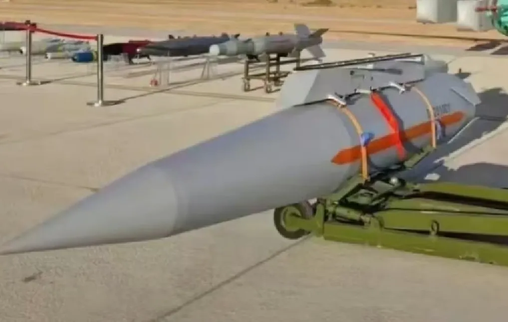 當然了,照片上彩虹-9型無人機最驚人的一點,當屬擺在它前邊的航空武器,大家關注到的都是畫面最前方的某型空面導彈。從外形來看,該型空面導彈帶有明確的雙錐體彈頭外形,塗裝有橙黃色的線條,應當是一枚高超音速飛行器惰性配重彈,就這一個細節讓大家嚇了一跳……
