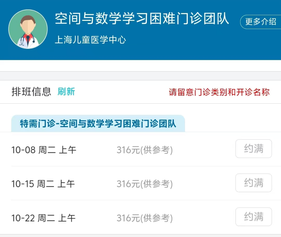 9月24日,上海交通大學醫學院附屬上海兒童醫學中心發文介紹,“空間與數學學習困難門診”將於10月8日開診。該門診由醫院心理衞生團隊與上海交通大學心理學院聯合設立,消息一經發布便在家長羣內廣泛傳播,號源也被一搶而空。