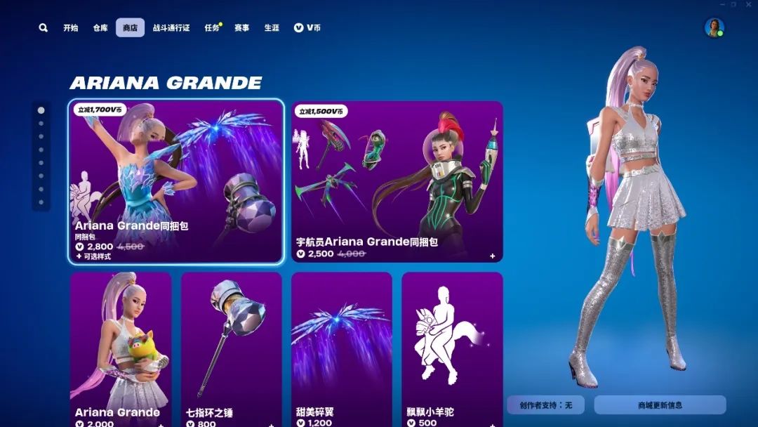 得益於UE5引擎的強大表現力,《堡壘之夜》過去看似比較“平”的卡通美術風格,實際上在長久的內容更新中展現出了獨特的高適應性。不管什麼文化領域的流行IP做進來,呈現效果上卻不會讓人出戏。拿現在的商店陳列來説,死侍與金剛狼這種美漫IP,看上去只能説“就像原生的”——而和A妹Ariana Grande的真人聯動,建模也沒有那種常見的“恐怖谷效應”,好像A妹自己走進了某個元宇宙的模擬人生裏。