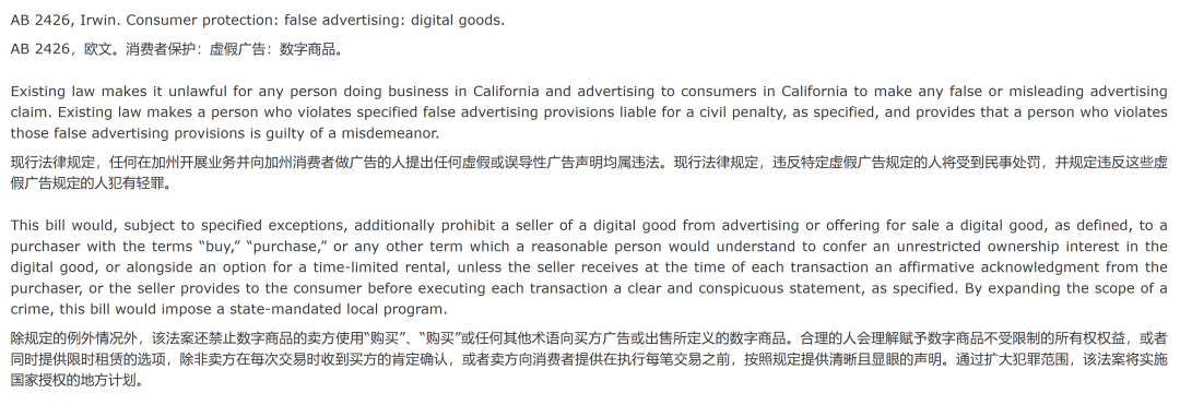 而在這條法案當中,加州政府特意強調,今後數字版商品的賣方禁止使用“購買”(Buy/Purchase)等相關術語向買方推廣或出售數字版商品。除非賣方能夠提供“清晰且顯眼”的警告——因為這些數字版商品的所有權,往往不在消費者手中。