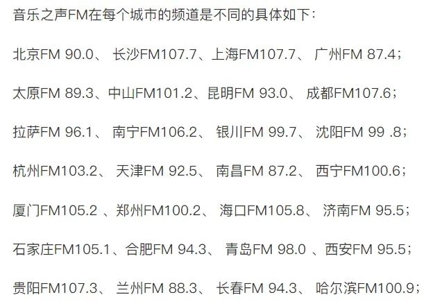 比如我常聽的 Music Radio 音樂之聲,在不同城市的 FM 頻率都不一樣,在杭州是 FM 103.2 ,在北京就是 FM 90.0 。