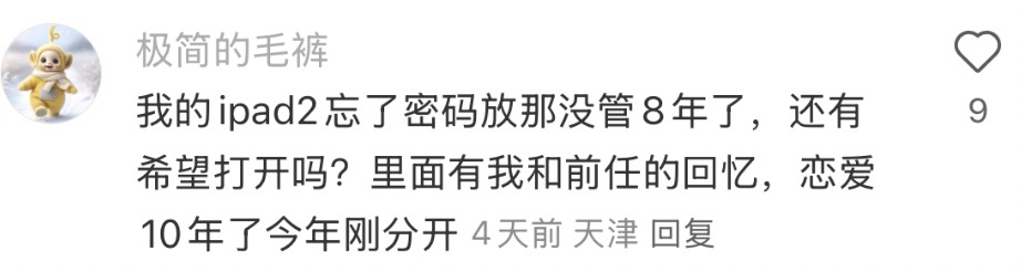有人回憶起自己被鎖了8年的iPad,裏面存有和前任所有的戀愛回憶,然而戀愛10年後,曾經的有情人還是難免分開的結局;