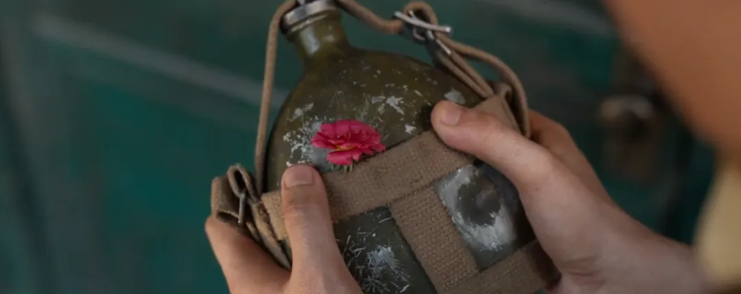 於是妹妹在哥哥的軍用水壺上插了一朵小花.