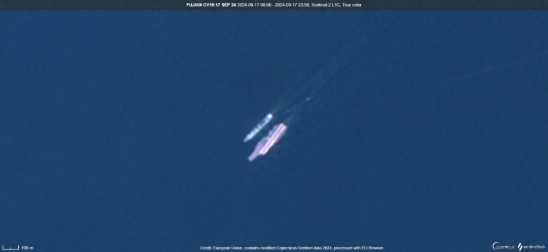 從流傳在社交媒體上的衞星照片來看,當901型綜合補給艦駛抵預定海域後,在此進行海試的福建艦便以約12節的速度,從後面慢慢接近了901型綜合補給艦的左舷,然後就開始了橫向補給測試。
