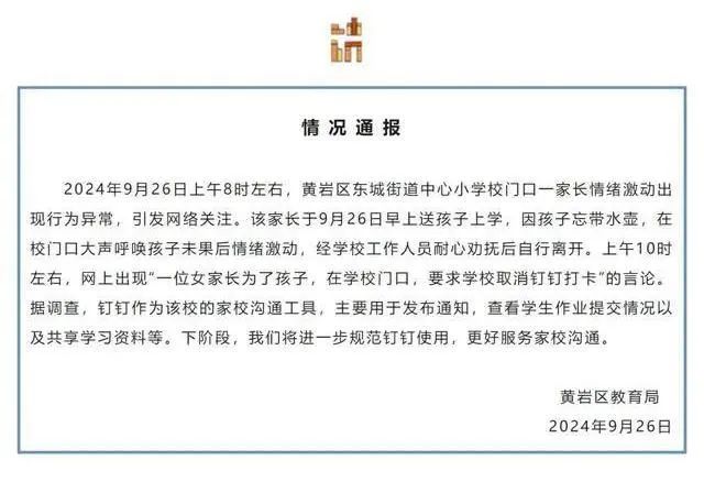 按照當地教育部門的説法,事情的直接起因,是孩子忘帶了水壺,該家長大聲呼喚孩子未果後,情緒才會這麼激動,與網上熱議的釘釘打卡無關。