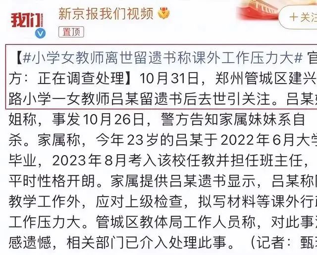 去年鄭州發生了一起自殺悲劇,一年輕女教師由於不堪校務過重,和學校的過分壓榨,選擇自我結束生命,年僅23歲。