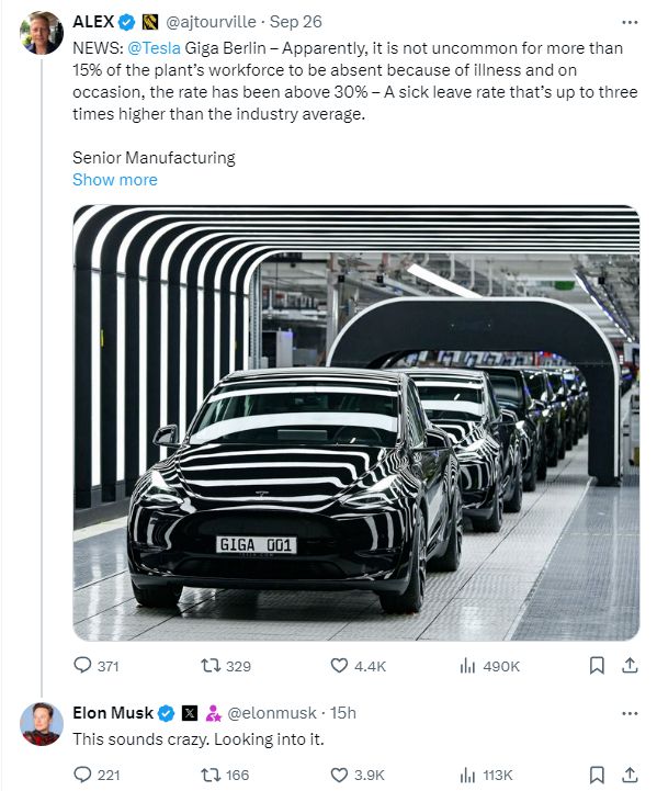 最近,特斯拉柏林工廠的高缺勤率,引起了馬斯克的注意。據報道,特斯拉柏林工廠的員工請病假比率在今年8月份突然攀升,是去年德國汽車行業平均水平的三倍多。對此馬斯克在X上表示正在調查這個問題。