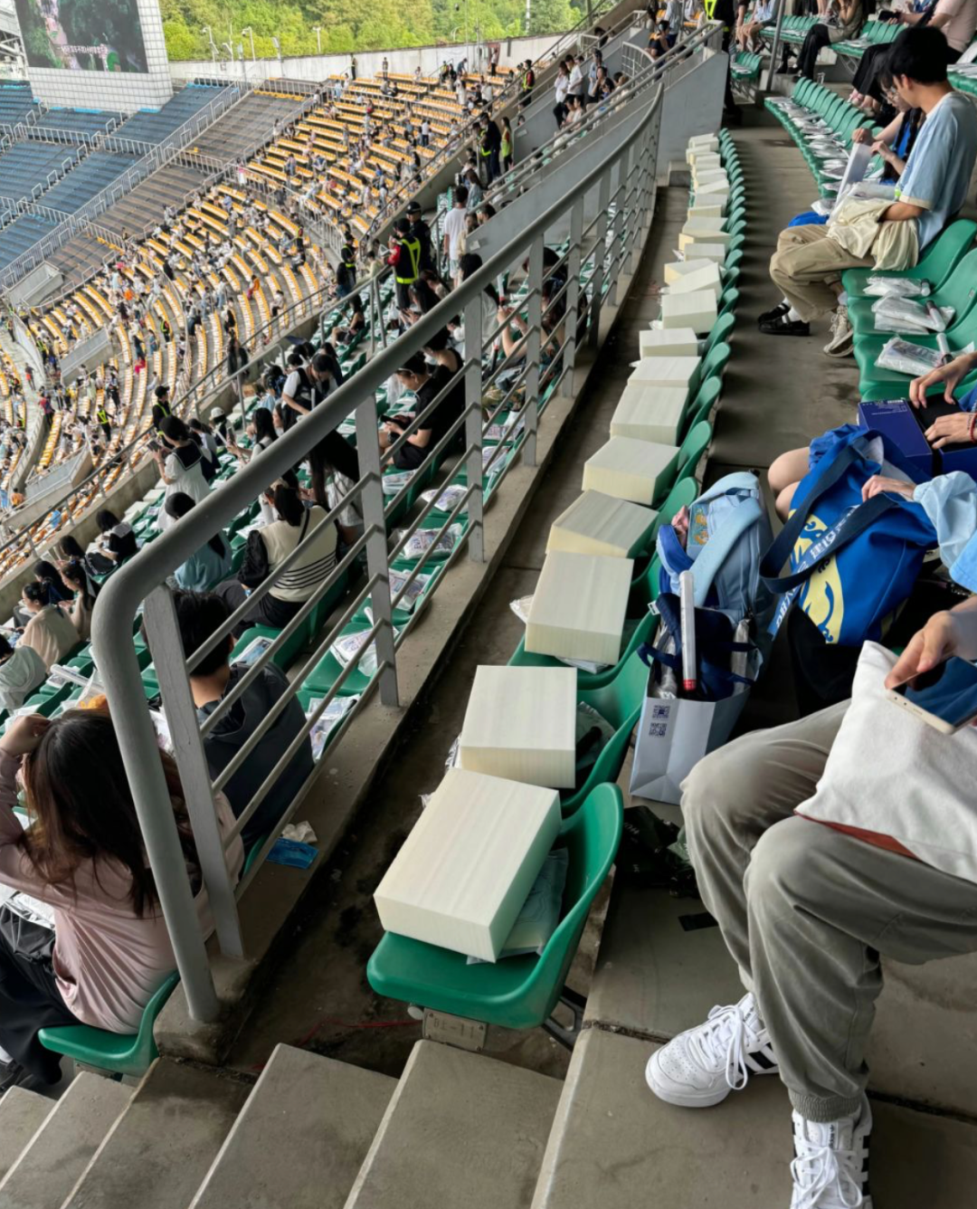 例如,南京場,在場館有圍欄遮擋部分,特定增加了增高墊,保證觀演體驗;由於恰逢高温,主辦方在現場設置冰袋領取點位,場地四周還設置了風扇與冰桶;看台區則通過冰塊水泡機降温,通道空調搭配大工業冰塊,讓觀眾得以在清涼中釋放熱情,還以補貼形式將水價調整為3元,避免了負面輿情。此外,加厚雨衣、驅蚊貼、降温貼、摺疊扇子,服務於女性觀眾的衞生巾、超量的廁所等等服務保障物資,更是每一場的標配。