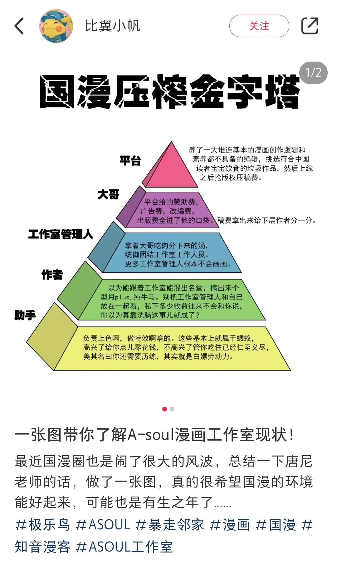 打響討伐A-Soul第一槍的漫畫家柳堡就提到,有雜誌編輯曾説給該工作室的稿費都是最高標準。比如極樂鳥年入一萬的2013年,其作品《暴走鄰家》在當年就創下超200萬元版税收入,極樂鳥也在2013年登上量漫畫作家富豪榜第九名。