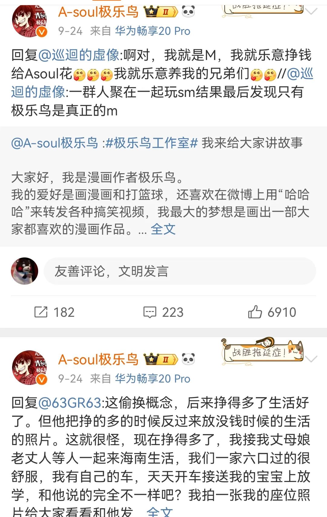 而極樂鳥、韓超等人的維護,或許也正如漫畫家北巷提到的某A-Soul頭部作者曾言,“自己需要那樣一個創作環境,不然畫不出東西來”,環境使然,有人甘之如飴。