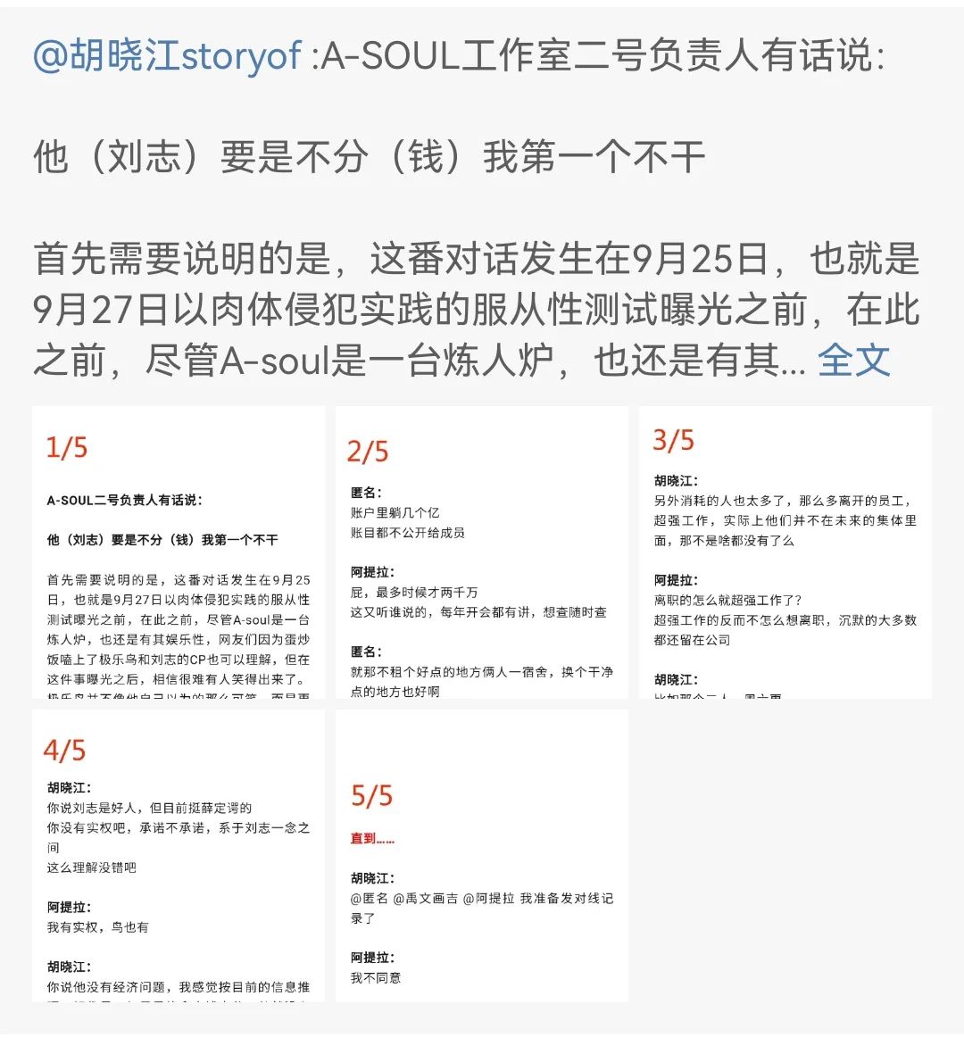 9月28日,曾登上熱搜前列引起破圈轟動的“A-soul工作室 PUA”事件再度引來新的爆料人。博主“胡曉江storyof”發出與A-soul二號負責人張越在“一個五百人漫畫羣”半公開對線的對話,並提到已經聽到內部消息稱“A-Soul準備起訴我”。