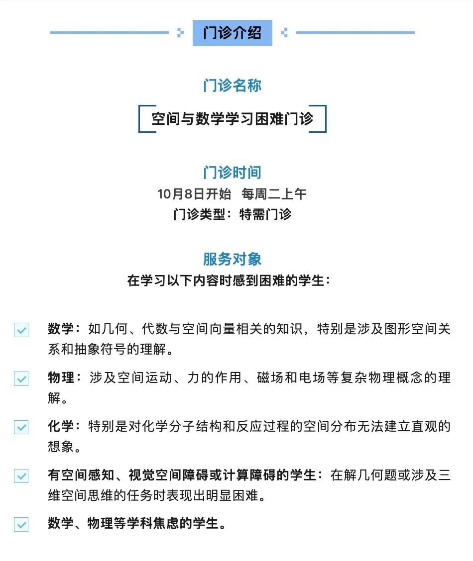 上海兒童醫學中心患者服務公眾號發佈的“門診介紹”顯示,該門診將會服務於對學習以下內容感到困難的學生:在數學上,如幾何、代數與空間向量相關的知識,特別是涉及圖形空間關係和抽象符號的理解;在物理上,涉及空間運動、力的作用、磁場和電場等複雜物理概念的理解;在化學上,特別是對化學分子結構和反應過程的空間分佈無法建立直觀的想象;在有空間感知、視覺空間障礙或計算障礙的學生,在解幾何題或涉及三維空間思維的任務時表現出明顯困難。