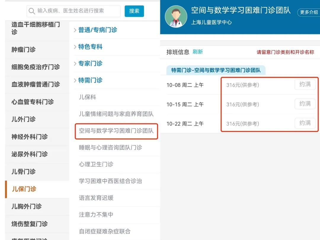記者在官方預約掛號渠道查詢看到,“空間與數學學習困難門診”系特需門診,掛號費316元(供參考),首批開放名額分別在10月8日、10月15日和10月22日。目前,這三天的就診號源已經全部約滿。