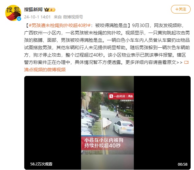 男孩遭未栓繩狗撲咬超40秒:被咬得滿臉是血_風聞