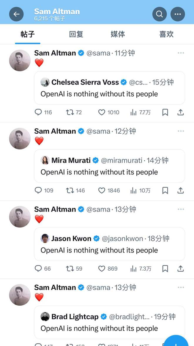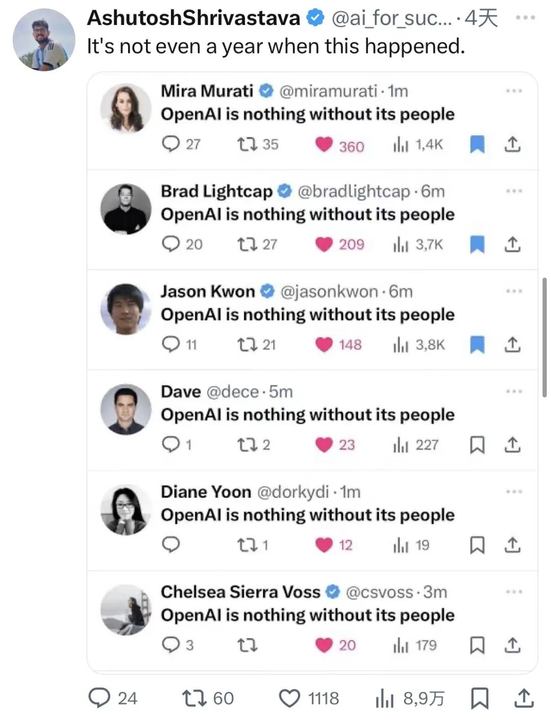 不知道大夥兒還記不記得,去年奧特曼被董事會罷免之後, OpenAI 員工集體在推特上發聲的事情,當時奧特曼還挨個給他們都點了贊。
