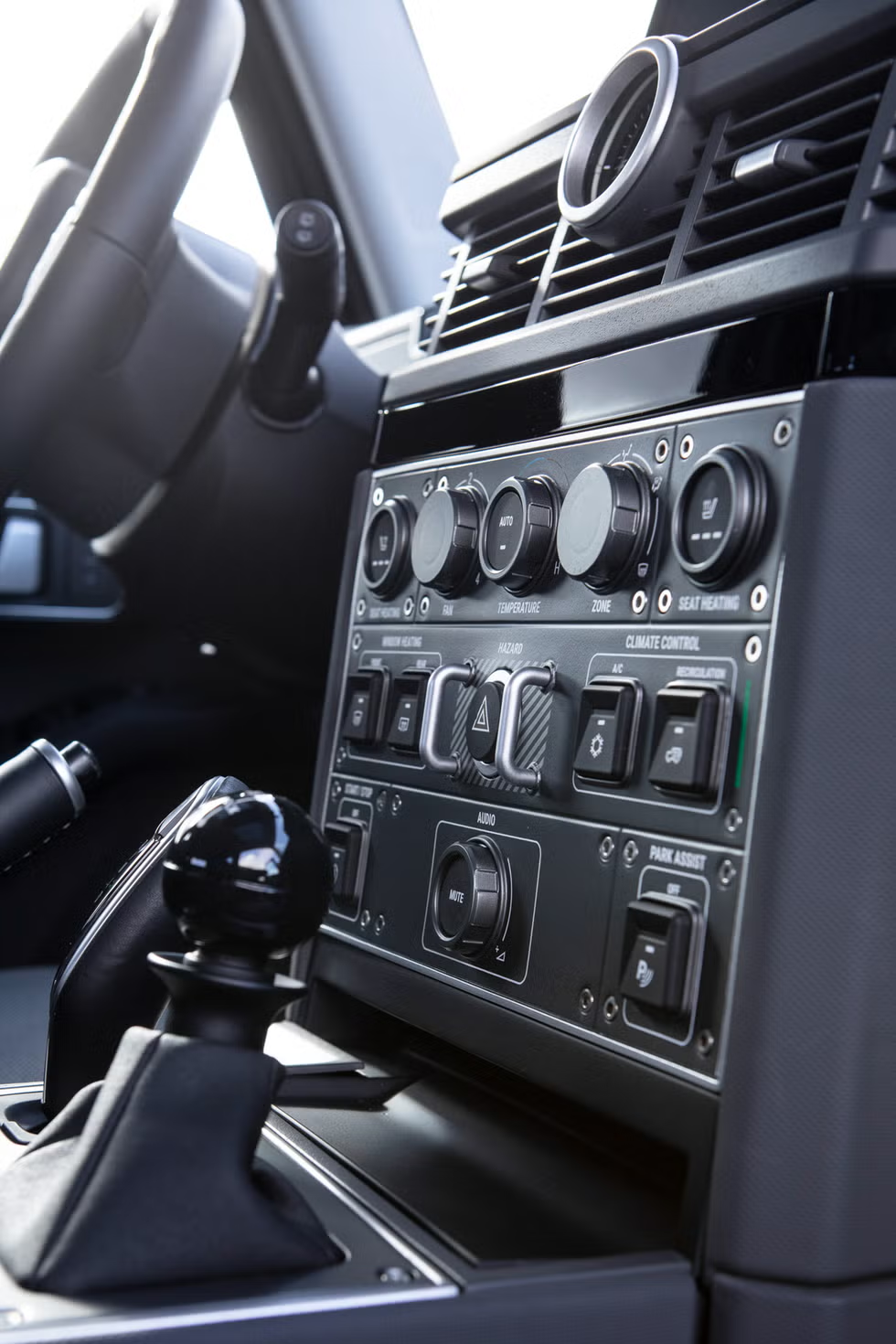 這車的外觀簡直就是對着老衞士復刻,硬朗平直的線條,三個方形側窗。。。不過,在車身尺寸上,擲彈兵的三圍是 4896x1930x2036mm,比衞士大了一圈(4641×1791×2029mm),反而跟奔馳大 G 差不多(4877x1931x1975mm)。