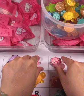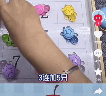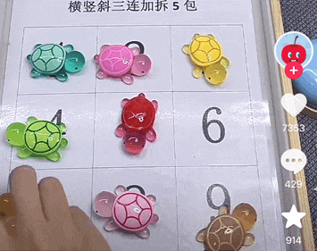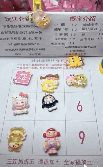 排到訂單後,主播把拆開的烏龜按順序擺放在“九宮格”中,顏色相同的是一碰,能加拆一包。