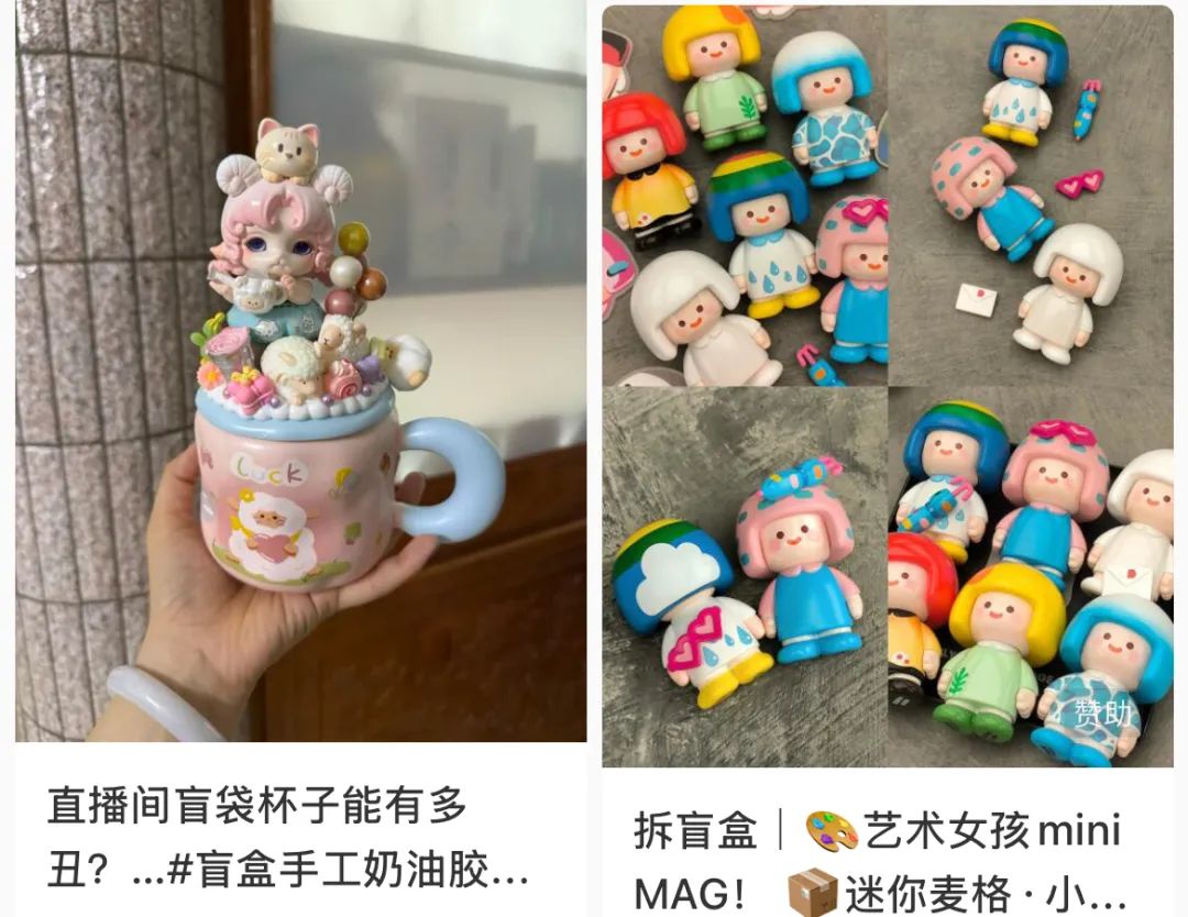比如小紅書上的手工博主,盲袋裏裝的是自己做的奶油膠手機殼、小杯子、項鍊等東西。雖然只有10萬粉絲但每晚的拆盲盒直播,都有數十萬觀眾直播。