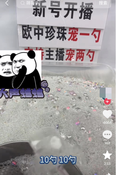 美甲鑽盲盒就是把美甲鑽,埋在象徵“沙漠”的小珍珠中,用户按需要購買特定數量的“勺子”,主播按照購買數量挖掘後篩除小珍珠,最後把美甲鑽打包寄出。