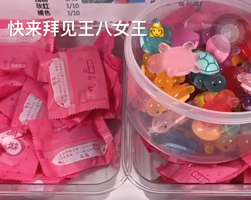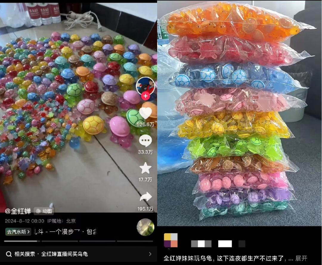 反觀爆火的盲盒直播間的產品堪稱寒酸:拼夕夕10元一大把的樹脂烏龜、點外賣就送的塑料鴨子、做工粗糙的數字方塊…….