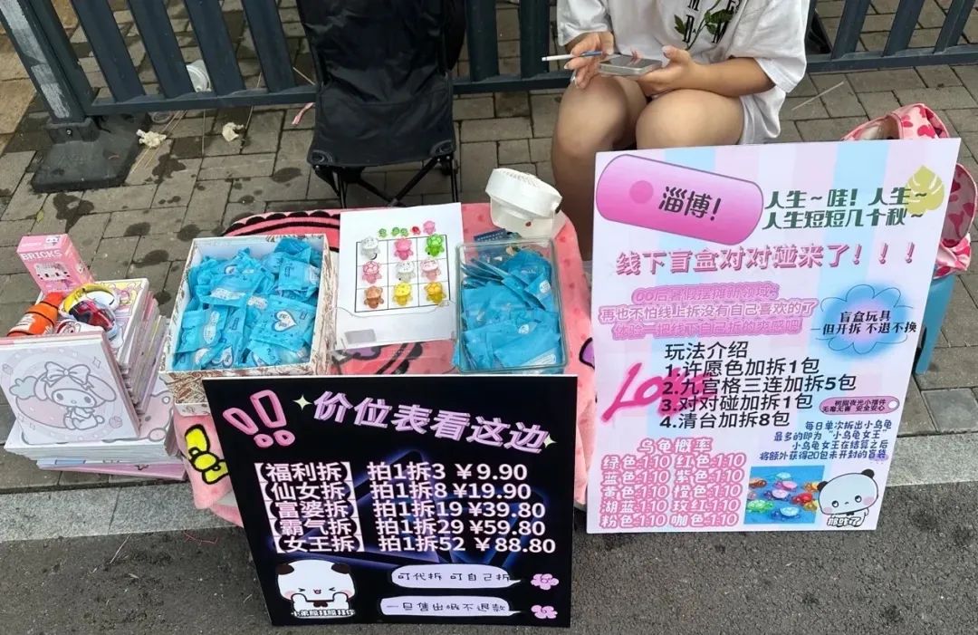盲盒對對碰擺攤成了斜槓青年的新副業,它門檻不高,只需要在1688上買幾百個小烏龜,一個桌子掛上簡單卻又醒目的手寫招牌,就能隨時開拆。