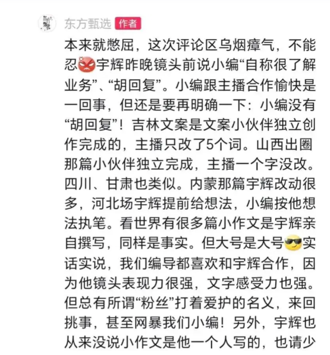 於是在東方甄選官方號的評論區,上演了一出小編手撕自家明星,直播訴苦大會,網絡鳴冤,賽博抗議。