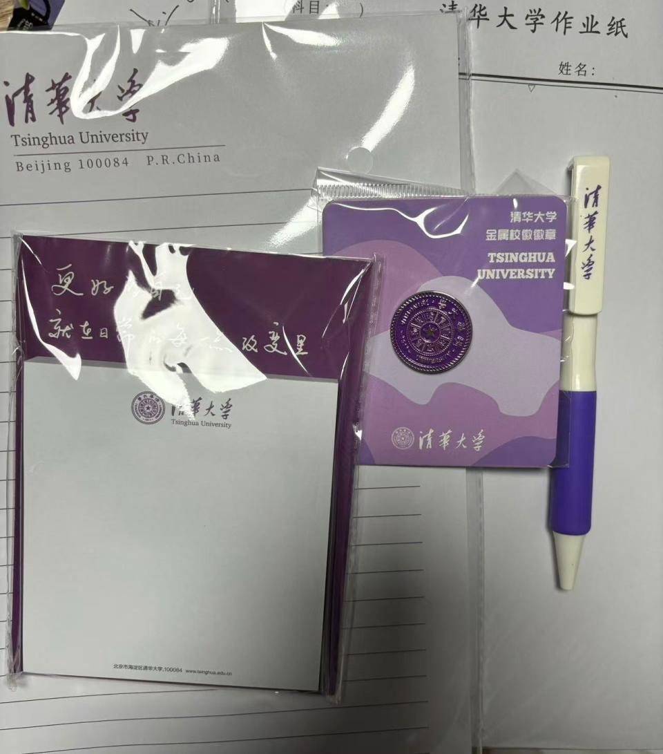 “哇塞,這麼多!全是清華的,連草稿紙、便籤紙都有。”昨天,7年級的小昊收到了一大袋清華大學周邊,本子、筆、冰箱貼、帆布袋,還有一件紫色的T恤。