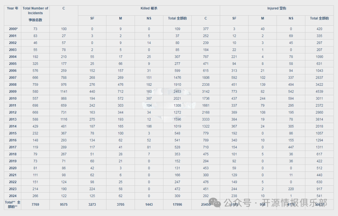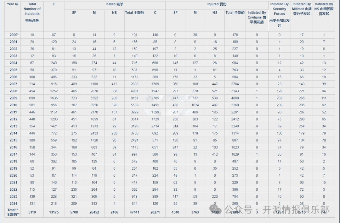 數據根據南亞恐怖主義研究整編,其中研究的數據來源是根據公開新聞報道整理,為臨時數據,數據日期自2000年3月6日起(數據表中用*表示),截至2024年9月29日(數據表中用**表示),數據僅供參考。