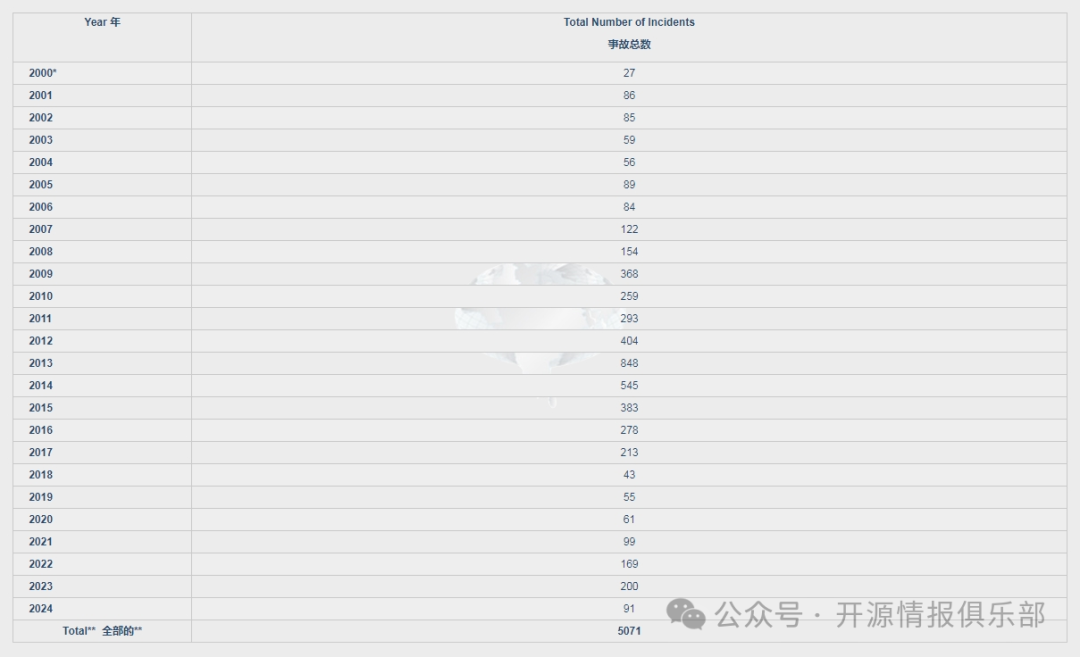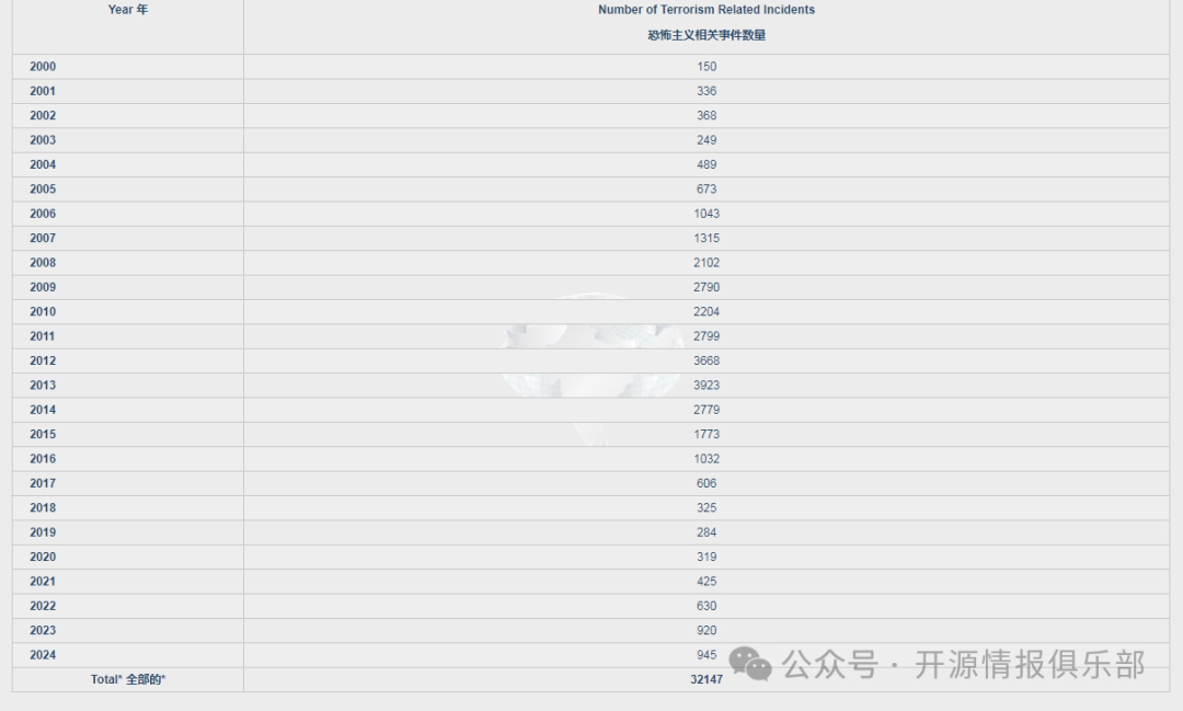 2000年3月6日起(數據表中用*表示),截至2024年9月29日(數據表中用**表示),巴基斯坦恐怖主義事件總數量為32147起。