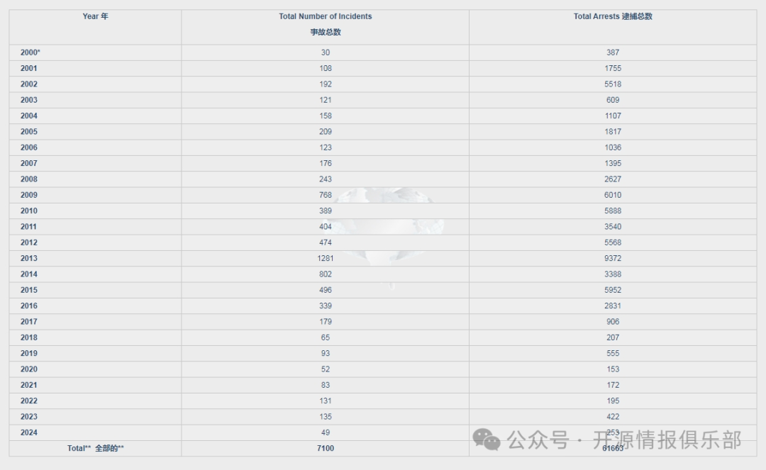 2000年3月6日至2024年9月29日,巴基斯坦總共有7100起逮捕事件,共計逮捕了61663名武裝人員。