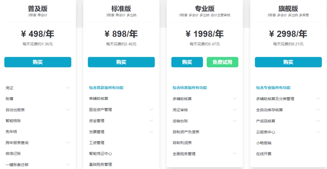 以用友暢捷通出品的好會計產品為例,該款產品是為小微企業量身打造的一款專業的智能雲財務應用,免安裝免維護,幫助財務人員通過PC端、手機端、微信端隨時隨地管理現金銀行、發票、往來、報税、經營分析等,明碼標價在線銷售。而且,不同服務內容的套餐,對應不同的產品價格。據其官網頁面顯示,價格從普及版到旗艦版,在498元/年到2998元/年不等。