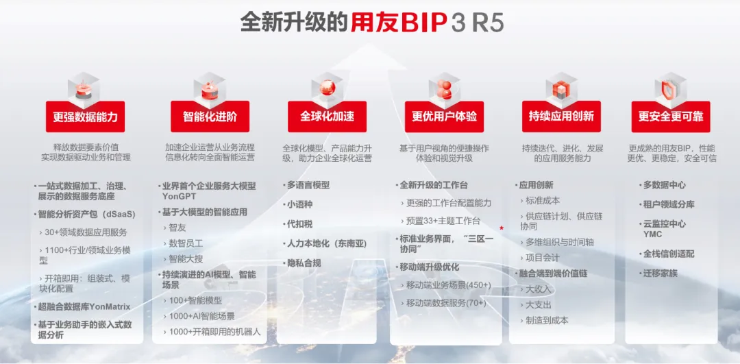 據官網介紹,用友YonBIP以大數據、人工智能、雲計算等前沿技術為基礎,構建了一個強大的企業智能大腦。