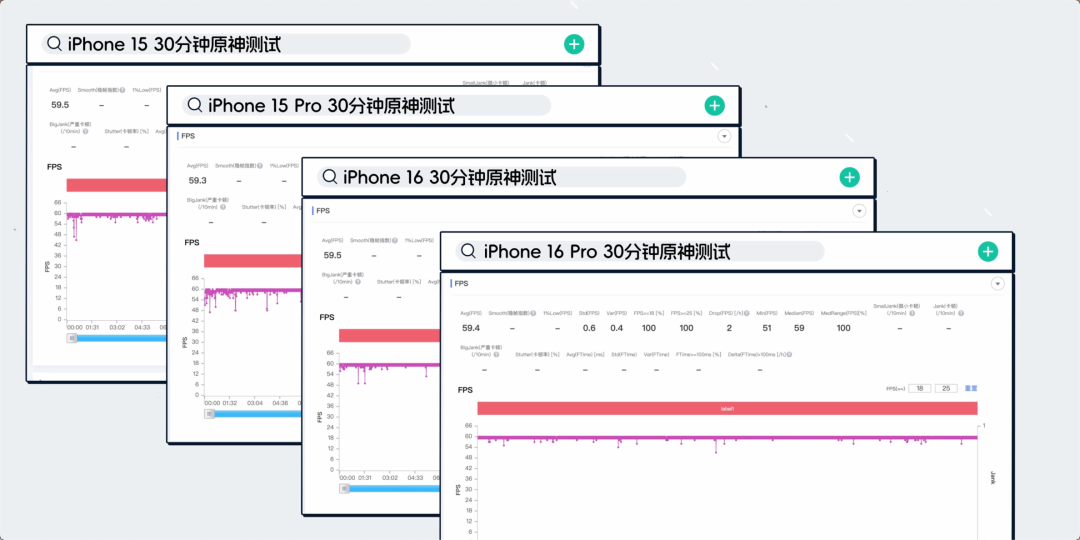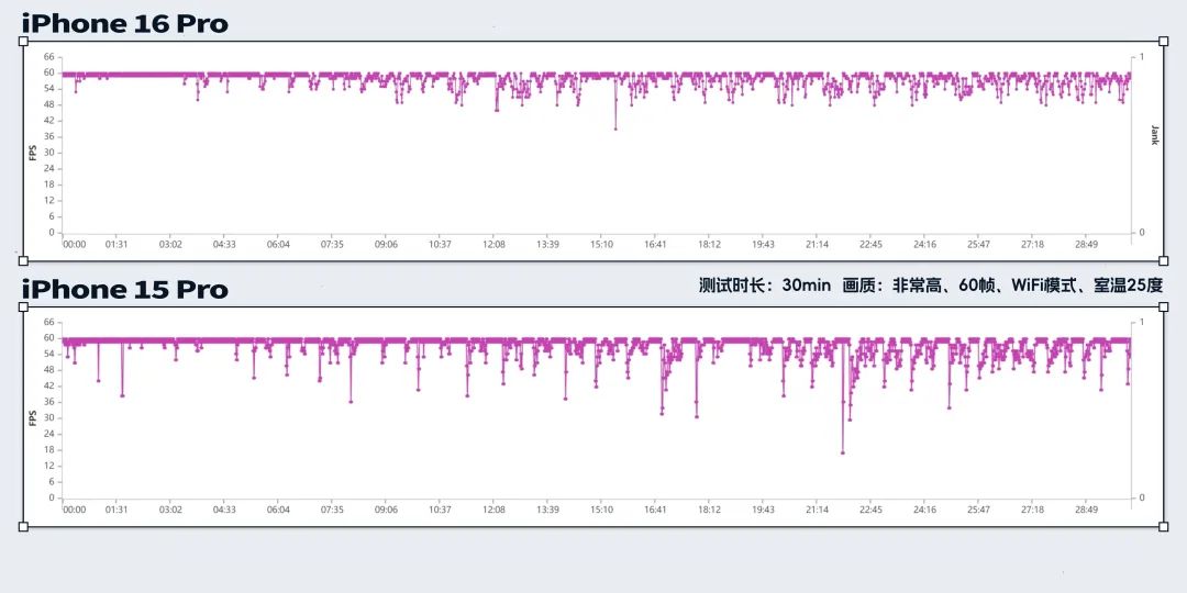 而且,通過分析幀率曲線也能看出,它的幀率明顯要比 15 Pro 要更加穩定。