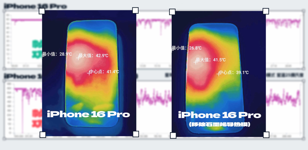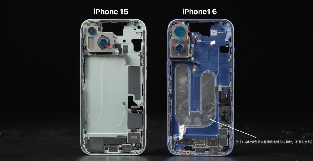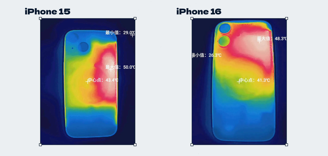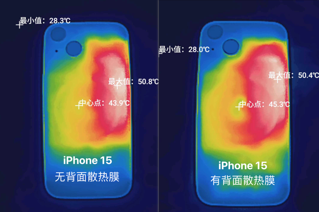 害,算了,吐槽歸吐槽,咱們 call back 一下前面的散熱膜問題——假如 iPhone 15 跟 16 一樣,也在相同的位置有一塊散熱膜,散熱效果會不會有改進?