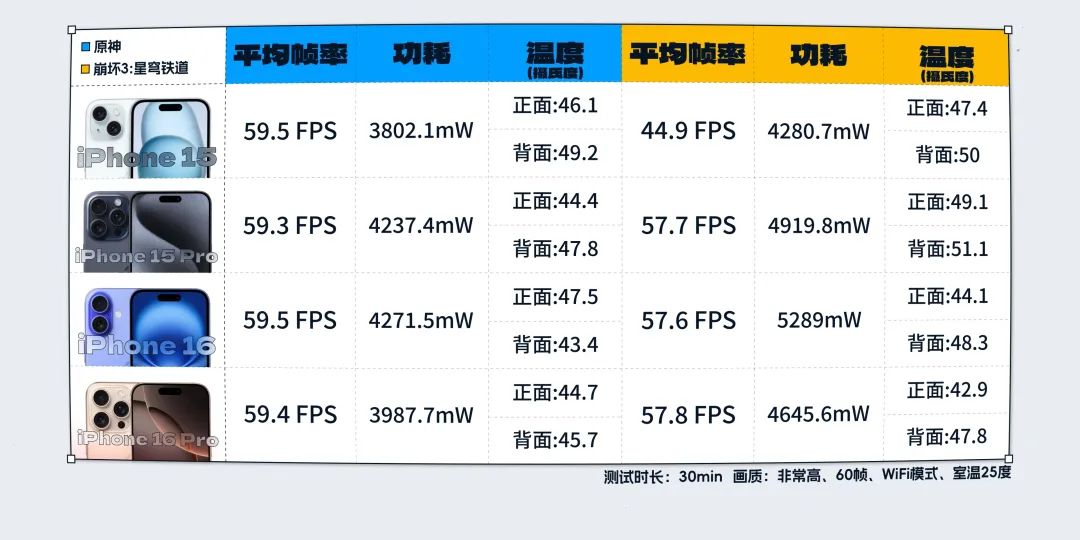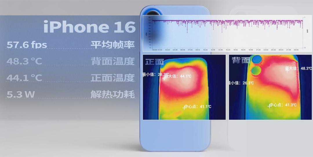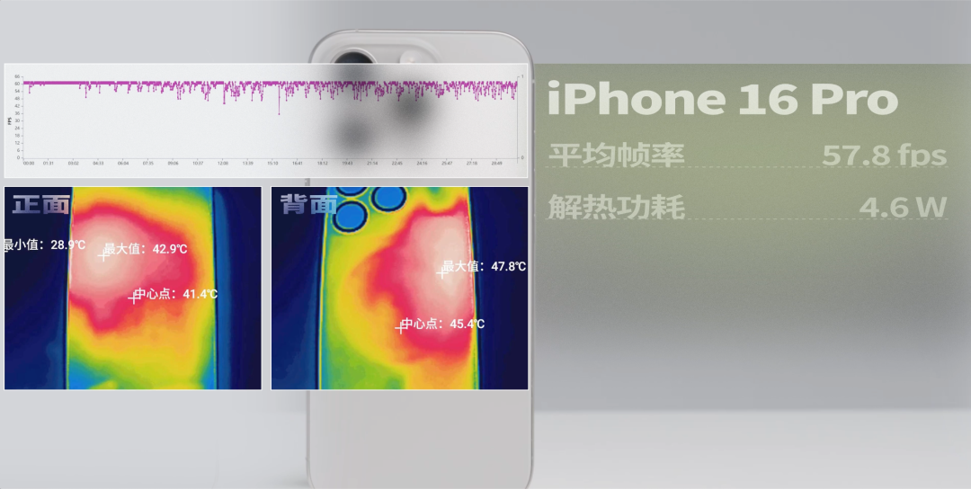 16 Pro 更是直接從 57.8 幀下降為 48.2 幀,少了快 10 幀,功耗也縮成了 3.7W ( 3727.4mW ),機身温度也低了幾度(正面 42.9 ℃→ 41.45 ℃,背面 47.8 ℃→ 45.3 ℃ )。
